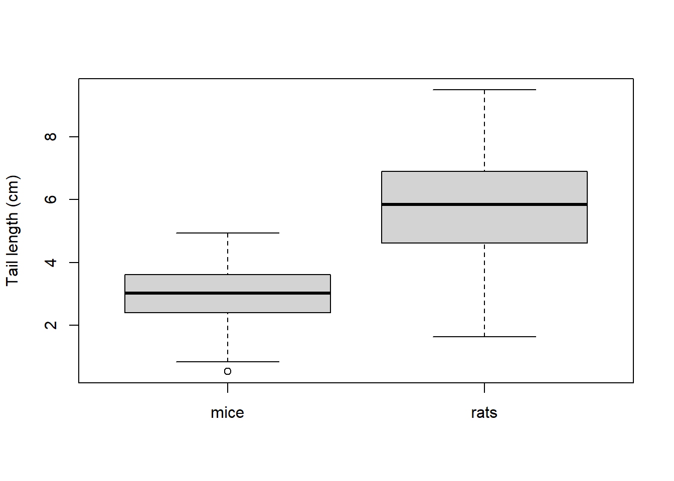 These descriptive statistics can be summarized graphically in the form of boxplot. That is very useful for comparisons between different datasets (e.g. comparison of mouse tail length with a similar dataset on rats):