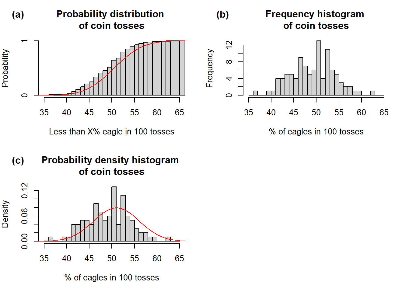 set.seed(42)# First, we need a randomly generated sample from binomial distribution# n = number of trials when eagle comes up (out of 100)# size = number of observations (each observation = 100 tosses)# prob = probability of eagle coming up in each tosscoin.r <-rbinom(n =0:100, size =100, prob =0.5)# Second, we need density function to plot theoretical probabilities on the plotcoin.d <-dbinom(0:100, size =100, prob =0.5)# Third, we also need distribution functioncoin.p <-pbinom(0:100, size =100, prob =0.5)# This is needed for plotting cummulative histogramh <-hist(coin.r, breaks =c(0:100), plot = F)h$counts <-cumsum(h$counts)/sum(h$counts)# Plotspar(mfrow =c(2,2), mar =c(5, 4, 4, 2))plot(h,xlim =range(35, 65),freq = T,main ='Probability distribution \nof coin tosses',ylab ='Probability',xlab ='Less than X% eagle in 100 tosses')lines(coin.p, col ='red')mtext("(a)", side =3, adj =-0.2, line =2, font =2)hist(coin.r, breaks =c(35:65),xlab ='% of eagles in 100 tosses',main ='Frequency histogram \nof coin tosses')mtext("(b)", side =3, adj =-0.2, line =2, font =2)hist(coin.r, breaks =c(35:65),freq = F,xlab ='% of eagles in 100 tosses',ylab ='Density',main ='Probability density histogram \nof coin tosses')lines(coin.d, col ="red", lwd =1)mtext("(c)", side =3, adj =-0.2, line =2, font =2)par(mfrow =c(1,1))