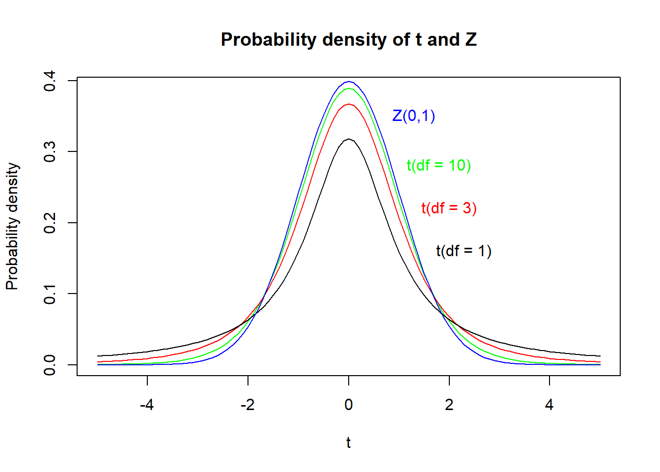 # t(df = 10)curve(dt(x, df =10), col ='green', xlim =c(-5, 5), xlab ='t', ylab ='Probability density',main ='Probability density of t and Z')text(x =1.8, y =0.28, label ='t(df = 10)', col ='green')# t(df = 3)curve(dt(x, df =3), add = T, col ='red')text(x =2, y =0.22, label ='t(df = 3)', col ='red')# t(df = 1)curve(dt(x, df =1), add = T, col ='black')text(x =2.3, y =0.16, label ='t(df = 1)', col ='black')# Z(mu = 0, sd = 1)curve(dnorm(x, mean =0, sd =1), col ='blue', add = T)text(x =1.3, y =0.35, label ='Z(0,1)', col ='blue')