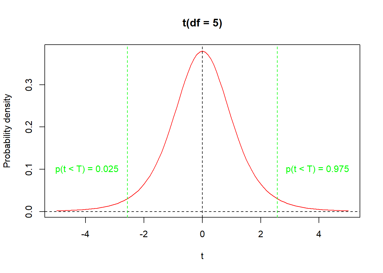 # curve for t(df = 5)curve(dt(x, df =5), xlim =c(-5, 5), col ='red',xlab ='t', ylab ='Probability density', main ='t(df = 5)')# zeroabline(h =0, lty =2)# maximum probability lineabline(v =0, lty =2)# 2.5% quantileabline(v =qt(p =0.025, df =5), lty =2, col ='green')# 97.5% quantileabline(v =qt(p =0.975, df =5), lty =2, col ='green')# text labelstext(x =-3.95, y =0.1, labels ='p(t < T) = 0.025', col ='green')text(x =3.95, y =0.1, labels ='p(t < T) = 0.975', col ='green')