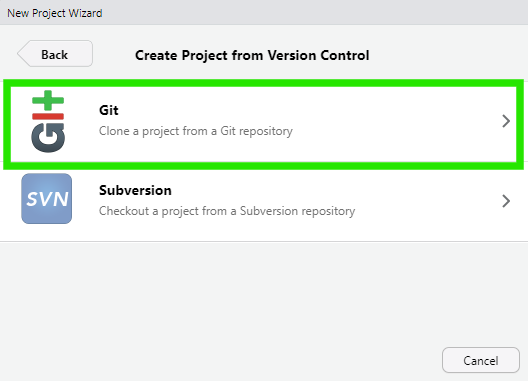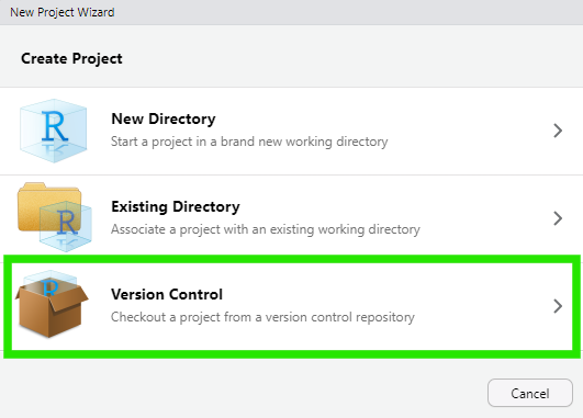 In RStudio, start a new project. Instead of the usual ‘New Directory’ click on ‘Version Control’.