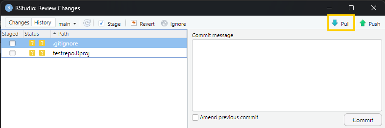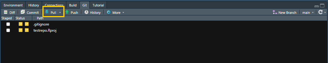 Now return to your RStudio, which is now one commit behind its remote counterpart. To synchronise the local repository with the remote, click on the blue ‘Pull’ arrow to pull the changes to your local repository. You can do that either directly in the Git window: