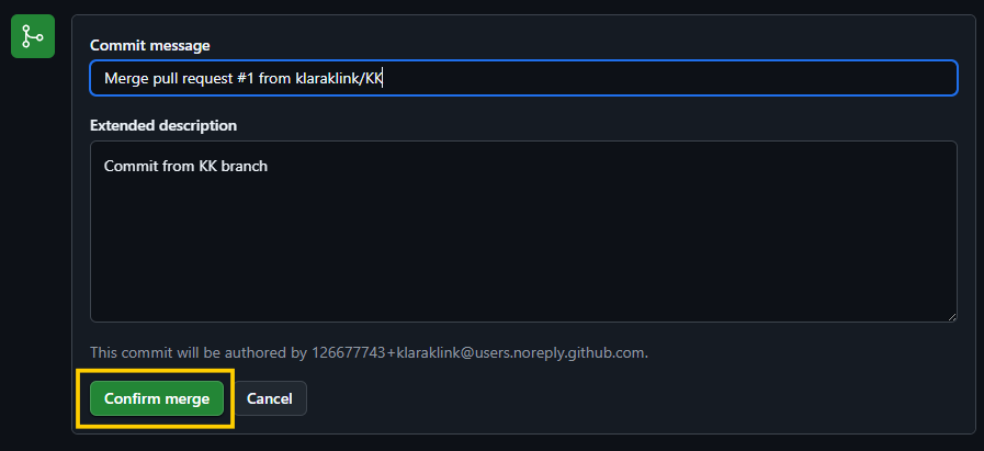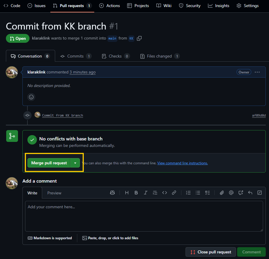 The changes you made are still not in the main branch, you just created a request to merge them into the main branch. The second step is to merge the pull request. You can either do it directly by clicking on the green button ‘Merge pull request’.