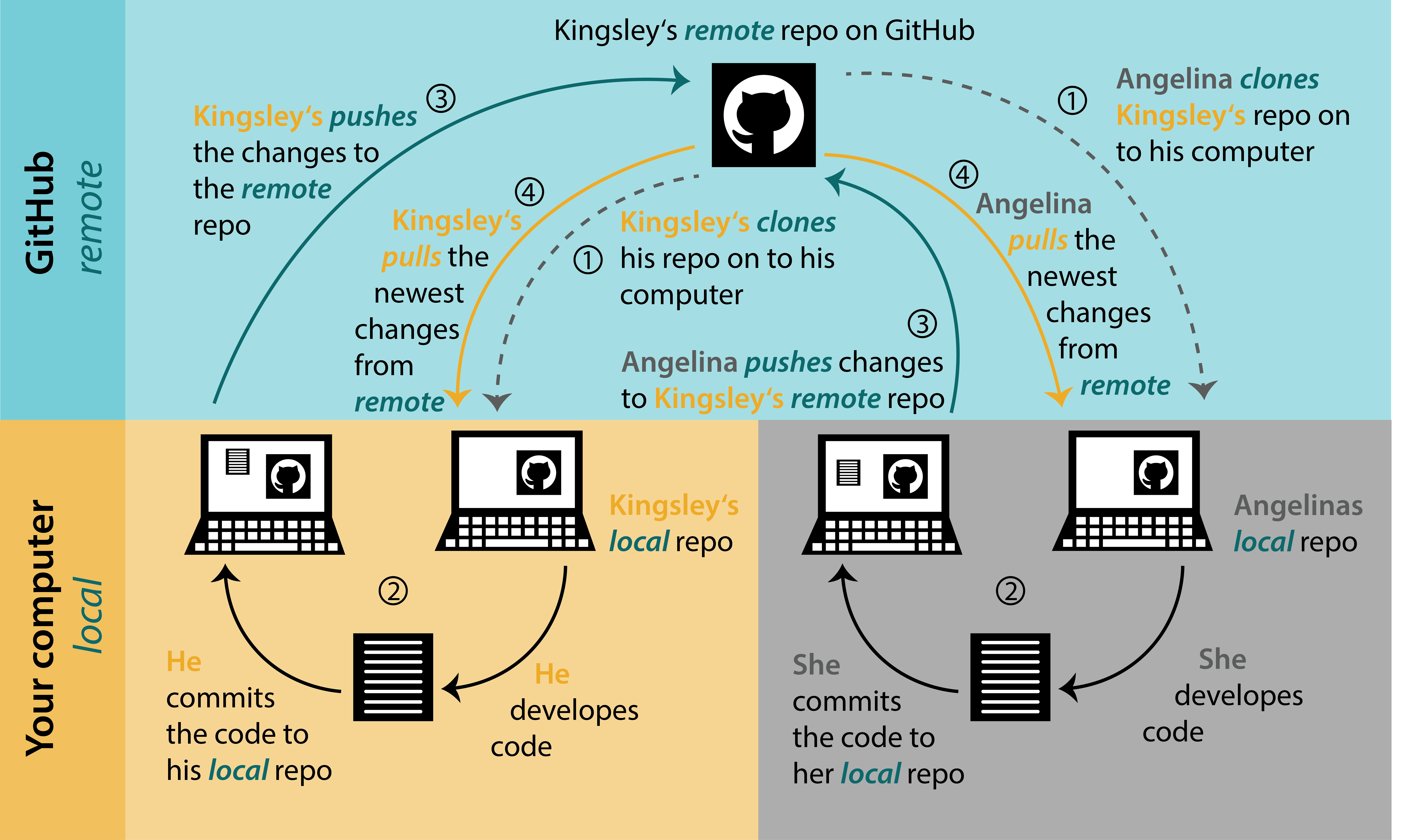 A huge advantage comes when you start to collaborate with other people. This is where hosting services for Git-based projects come in. We already showed you a little bit of GitHub in this course, but we will explain its functionalities more consistently and in more detail now. Git is a software that you have locally on your computer. GitHub is the host server, allowing for collaboration of multiple people on the same project. Imagine it as if you have a Word document where you work on your own, but move it to Google Docs so that more people can collaborate on a single file. But there’s much more than in Google Docs. With GitHub, you can, for example: