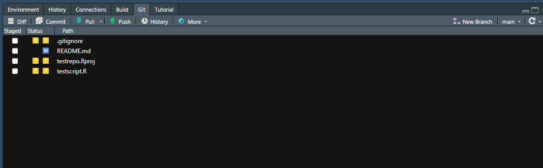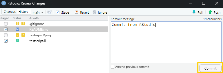 Modify the README file, e.g. by adding a line ‘This is a line from RStudio’ and create a new R script with a few lines. Save your changes.