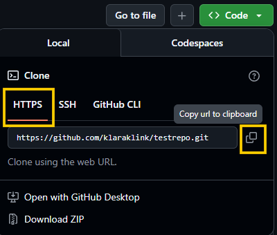 To link the repository to a folder in your computer, click the green button ‘<> Code’ and copy the URL to clipboard