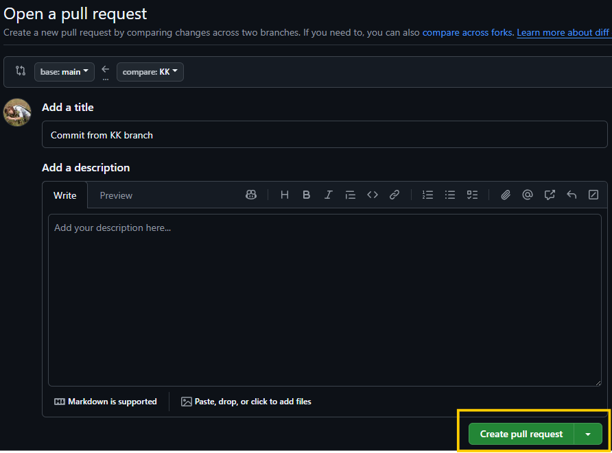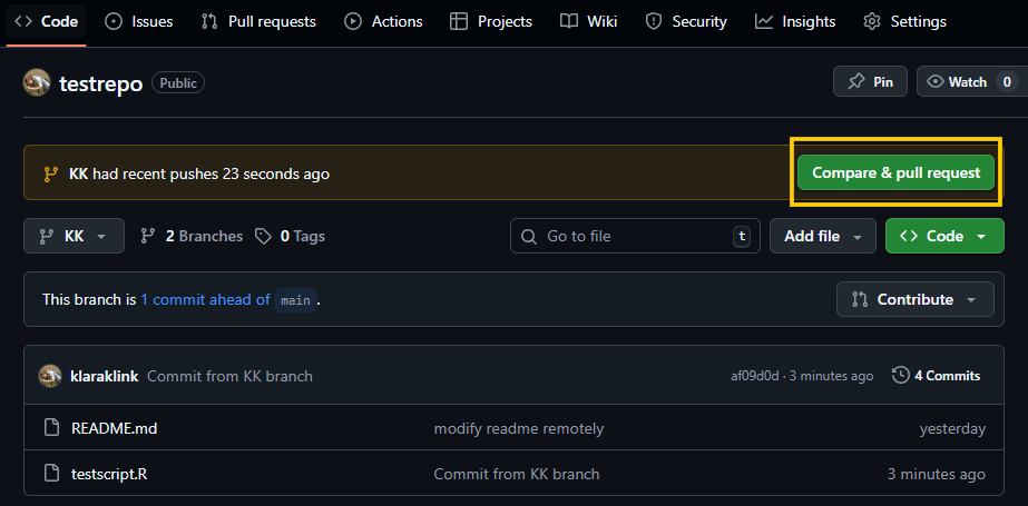 To merge the changes back to the main branch, you can make a pull request. Click on the green button ‘Compare & pull request’.