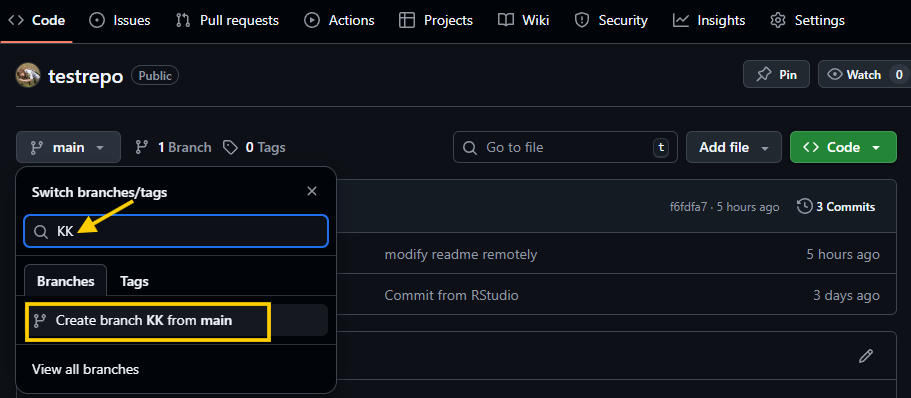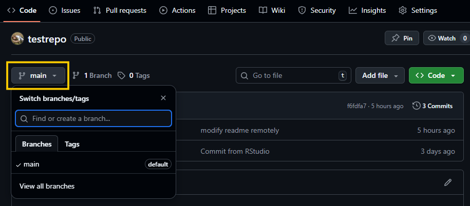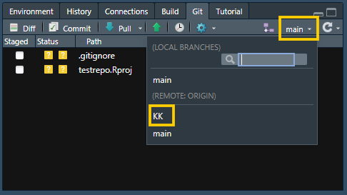 In the remote repository, you are now switched to the branch you just created. Come back to the local in your RStudio. To switch to your branch there, pull the remote changes first. Then click on the branch name in the upper right corner of the Git pane and then select your branch.