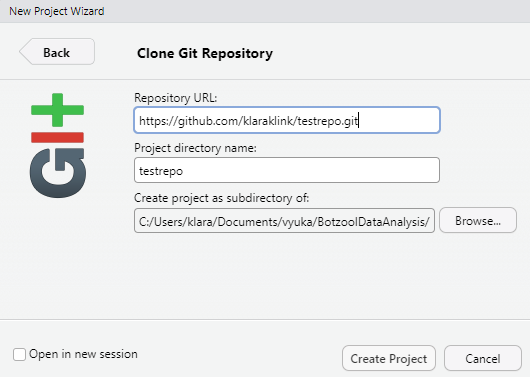 Choose a folder where you want your project to be saved. It might be the folder you use for this course. Click ‘Create Project’. This will create an R project in your computer linked with the remote GitHub repository.
