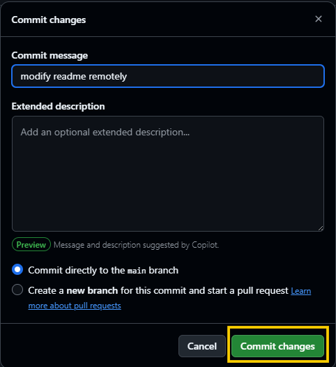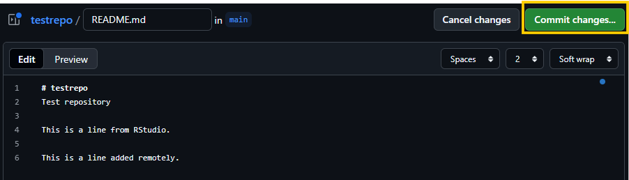 Add a line, e.g., ‘This is a line added remotely.’ and click on the green button ‘Commit changes…’.