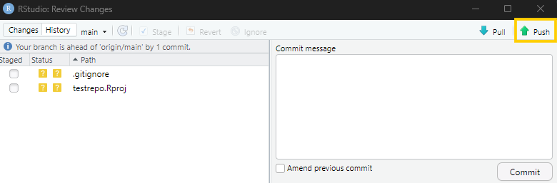 Now you have committed the changes locally. In the top left of the popup window, you will see a message, that ‘your branch is ahead of ’origin/main’ by one commit. It means you have locally committed some changes that are not synchronised with the remote counterpart yet. To send your changes to the GitHub remote repository (push), click on the green ‘Push’ button.