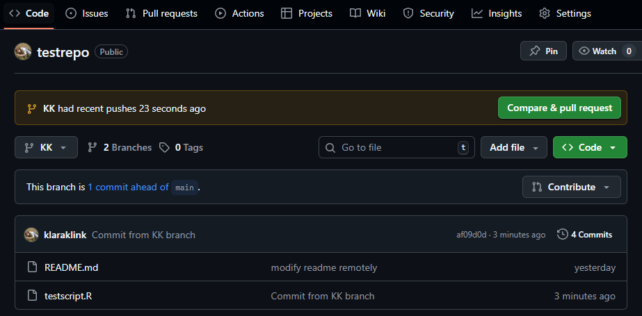 Now you can make some changes (for example add a new script), commit them and push to the remote. Check the GitHub webpage, if the changes are visible there. You should see something like this:
