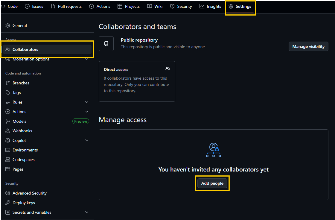 A huge advantage of GitHub or other hosting services is that you can collaborate with others on the same project. You can add collaborators to your repository by clicking on ‘Settings’ > ‘Collaborators’ > ‘Add people’.