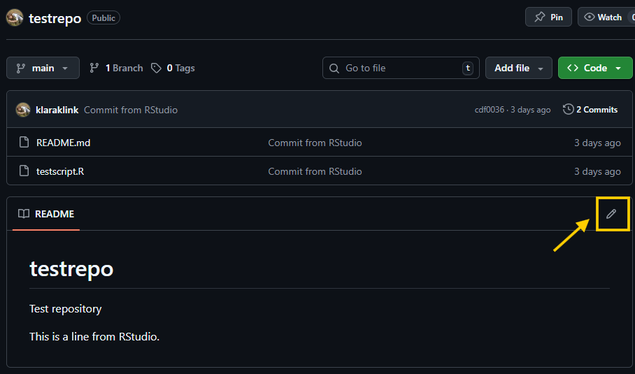 Let’s stay in the remote GitHub repository for a while and try another way to modify files in the repository. At the GitHub webpage, click on the pencil at the top of the readme file to edit it.