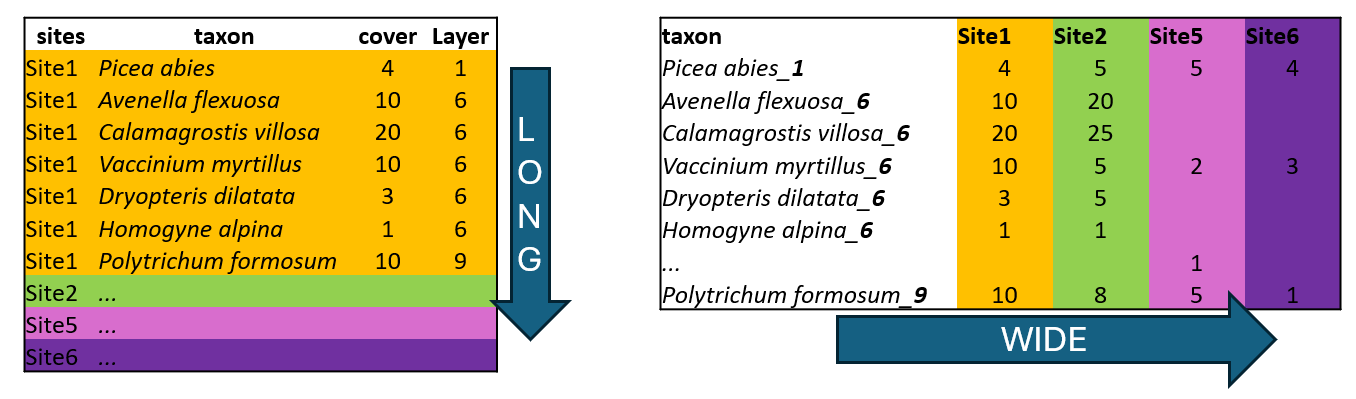 Wide format is more conservative and used in many older packages for ecological data analysis. This is the way you need to prepare your species matrix for ordinations in vegan