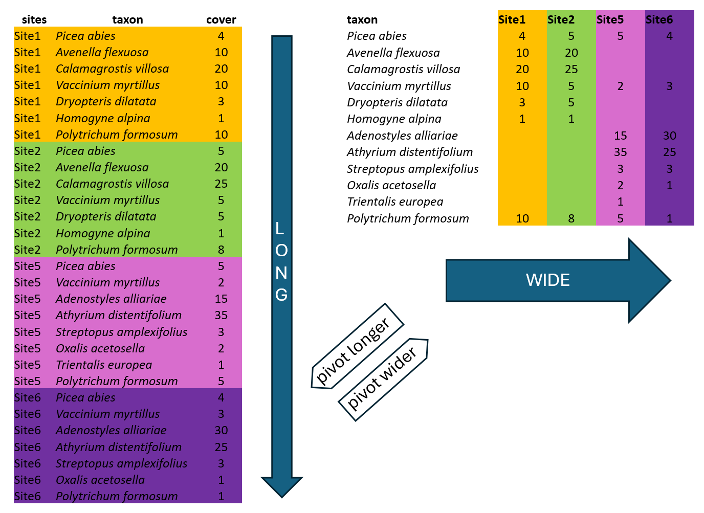 Another disadvantage is that you cannot add easily new information. If you for example want to separate species that are in a tree vegetation layer (recognised in vegetation ecology as 1), herb layer (6) and moss layer (9), you would have to add this information to the name of the species e.g. Picea_abies_1. Can you see a conflict with the basic principles of tidyverse?