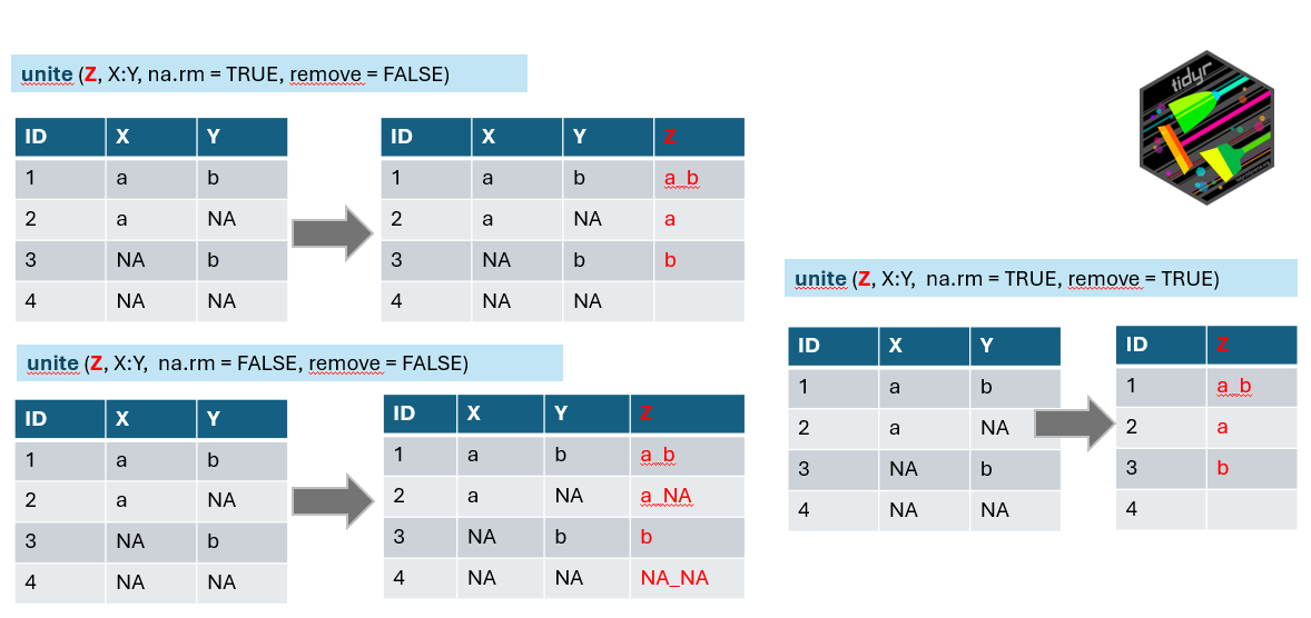 Argument na.rm indicates what to do if in one of the combined columns there is no value but NA. We have set this argument to TRUE to remove the NA. If you keep it FALSE it can happen that in some data the new string will be a_NA or NA_b, or even NA_NA (see line 4 of our example).